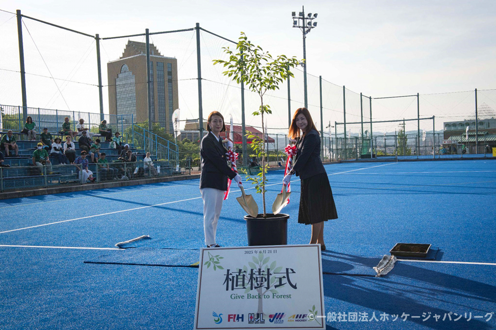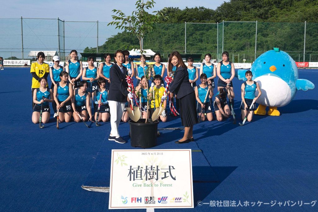 ホッケージャパンリーグ(HJL)が持続的な競技運営と、地球環境を守るための新たな取り組みに着手した。女子のさくらリーグがレギュラーシーズン終盤を迎えた2025年6月21日、3試合が行われた会場の駿河台大学ホッケー場(埼玉・飯能市)で「森へ恩返し」しようと、試合後に植樹式が開催された。