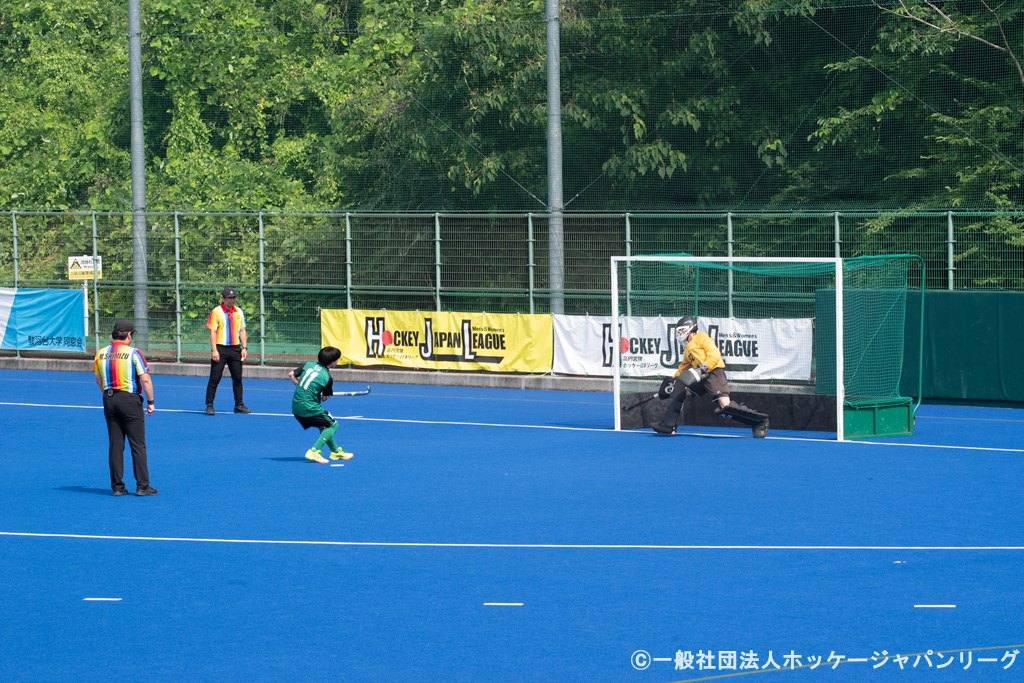 駿河台のセンターパスにより試合が開始された。3分東京農業が右サイドから攻撃を仕掛けサークル侵入するが、シュートには至らない。再び東京農業が右サイドからチャンスを作り、サークル内へボールを入れるが、これもシュートには至らない。7分駿河台#18大野がリバースシュートを放つが、反則により、東京農業のボールになる。その後両者激しい攻防が続くが、得点には至らない。14分駿河台がゴール前の混戦から#5山崎がリバウンドシュートを決め、1ー0で第1Qが終了する。第2Q開始早々東京農業が激しい攻撃を仕掛け、22分#6河野のスイープシュートが決まり、同点に追いつく。その後も東京農業が高いポゼッションを維持し、#21山口がリバースシュートを放つが、枠を捉えることができない。マイボールの時間が少ない駿河台も何とか攻撃するがチャンスを作れない。28分東京農業#28杉元がヒットシュートを放つが、駿河台#32岡田の好セーブにより阻まれる。30分駿河台の反則により、東京農業がPSを獲得。#11林がシュートを決め、追加点を挙げる。2ー1で東京農業が逆転し、前半戦が終了する。
