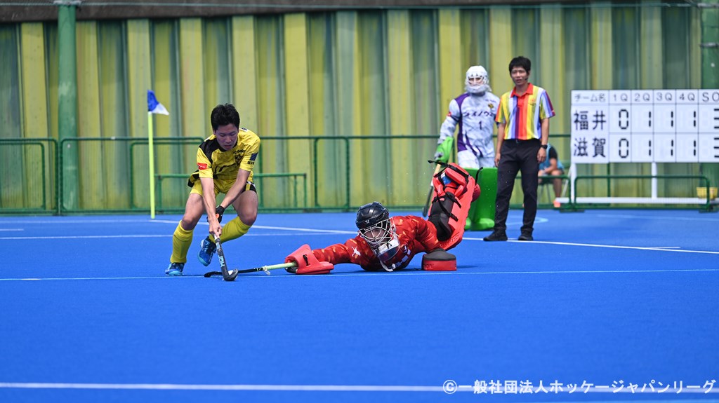 第3Q、33分福井PC獲得しタッチシュートこころみるが#11瀧上のナイスディフェンスによりゴールならず。34分BS滋賀PC獲得 #11瀧上からのパスを受けた#5渡辺のタッチシュートが決まり逆転する。43分福井#10三谷がピンポイントでスクープパスを通し、PC獲得 #11渡辺がヒットシュートはなつもゴールならず。43分福井再びPC獲得、#9佐伯のフリックシュートが決まり同点においつく。43分福井が立て続けに2本のPC獲得するも#12GK中川のファインセーブによりゴールできず。44分福井#11渡辺がセンタリグンを通し#15渡邊が飛び込むもあと一歩のところであわず。その後も一進一退の攻防が続くがお互い一歩も譲らず2対2で第3Q終了。第4Q 47分福井#3近藤が中央からのドリブルにサークル手前でBS滋賀が反則しPC獲得。48分福井PCからサークル内でパスをまわし最後は#5爲國がゴール左上隅にプッシュシュートを決め再び逆転し3対2と勝ち越す。58分福井#9佐伯のスピードにのったドリブルでゴールにせまるがBS滋賀の堅い守備に阻まれゴールならず。59分BS滋賀のスクープパスがサークル内に通りPC獲得。60分PCから#11瀧上から#3畑野がタッチシュートをあわせ土壇場で同点においつき試合終了。シュートアウト戦にもつれ込む。