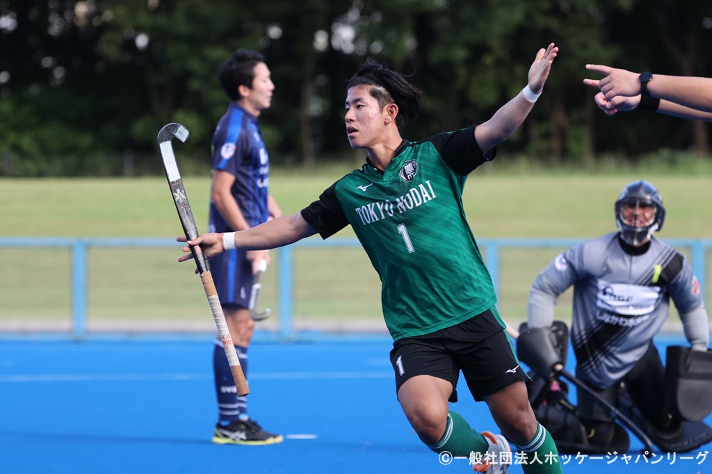 第1Q序盤は、両チームともにハイボールなどを活用して前進し、好機をつくるものの、最後にミスが出たり、守備を崩しきれず、一進一退の攻防が続いた。均衡を破ったのは東農大。9分、PC(ペナルティーコーナー)から#14曽根のフリックシュートがポストに当たり、そのリバウンドをキープした#2植木がリバースシュートでGKの頭上を抜き、先制点を挙げた。さらに12分にも、再びPCから#14曽根のフリックシュートがゴール右上に決まり、東農大が2-0とリードを広げた。フリークスも幾度となく攻め上がるが、シュートまで持ち込めず。東農大の素早い詰めとプレスが攻守にわたり光り、試合を優位に進める。
